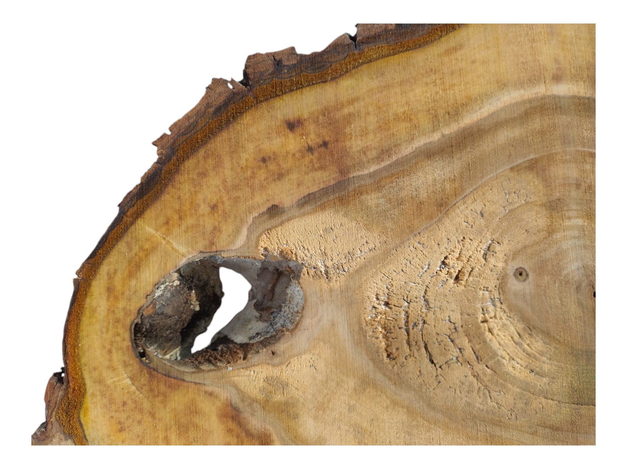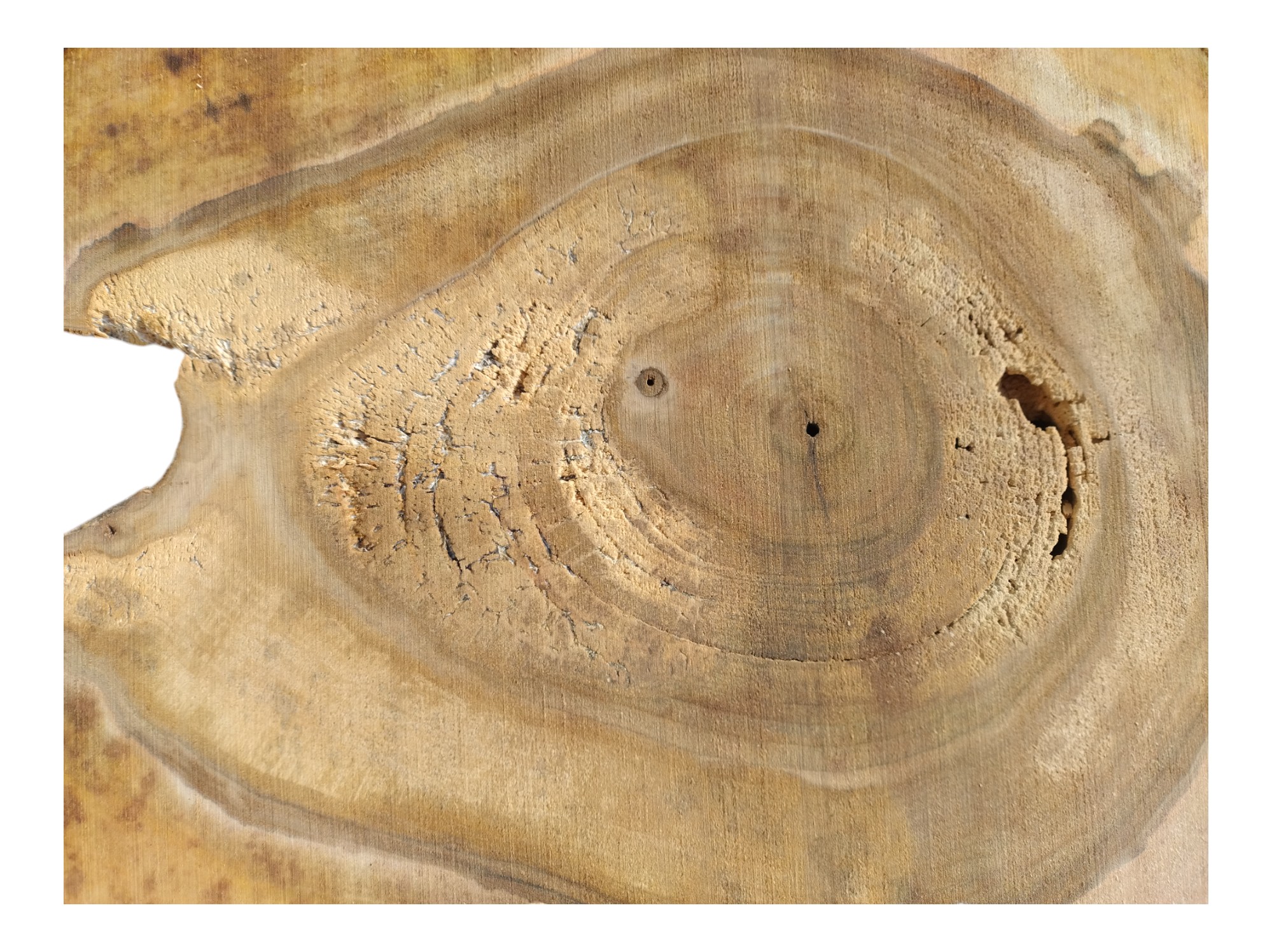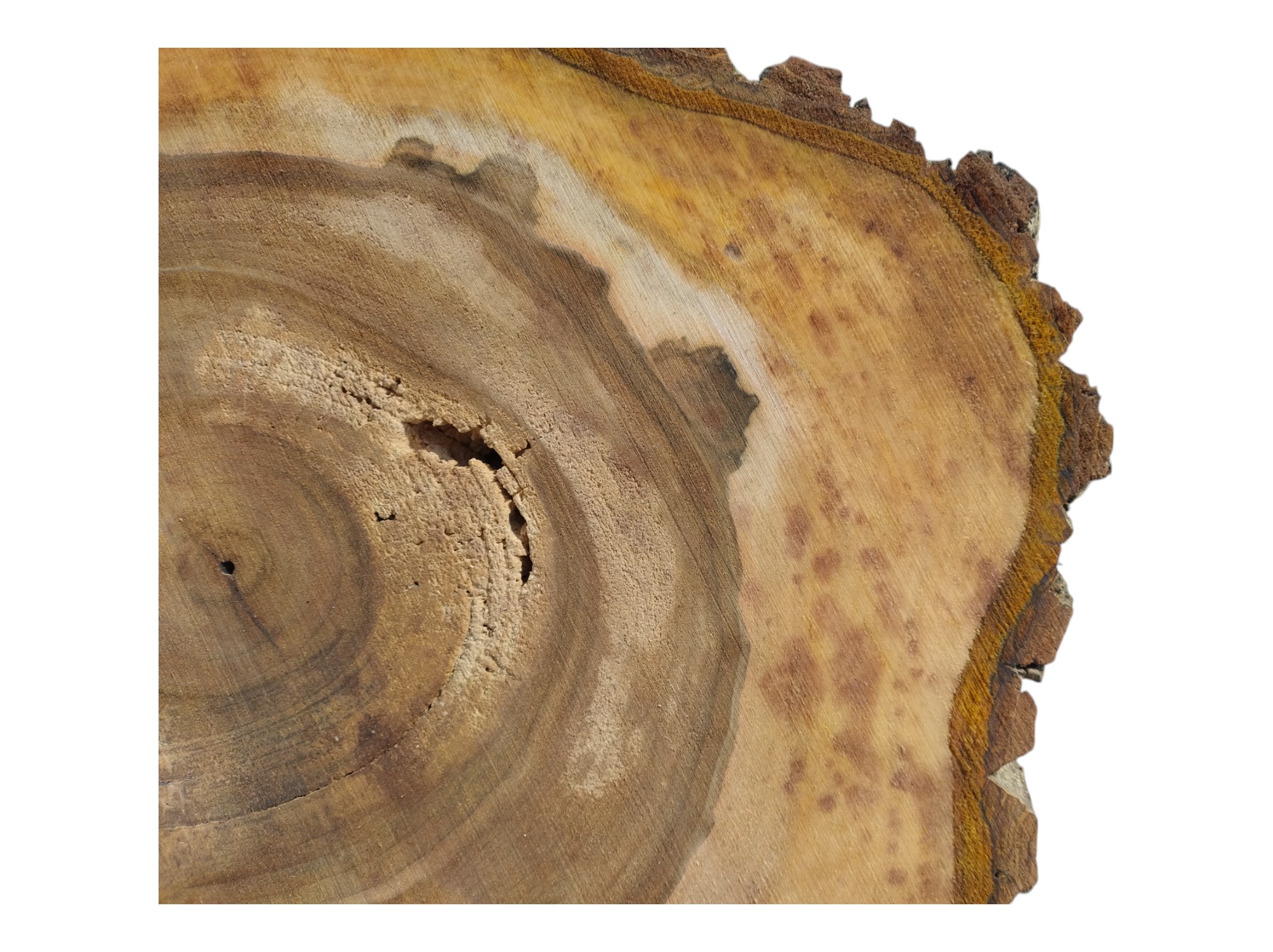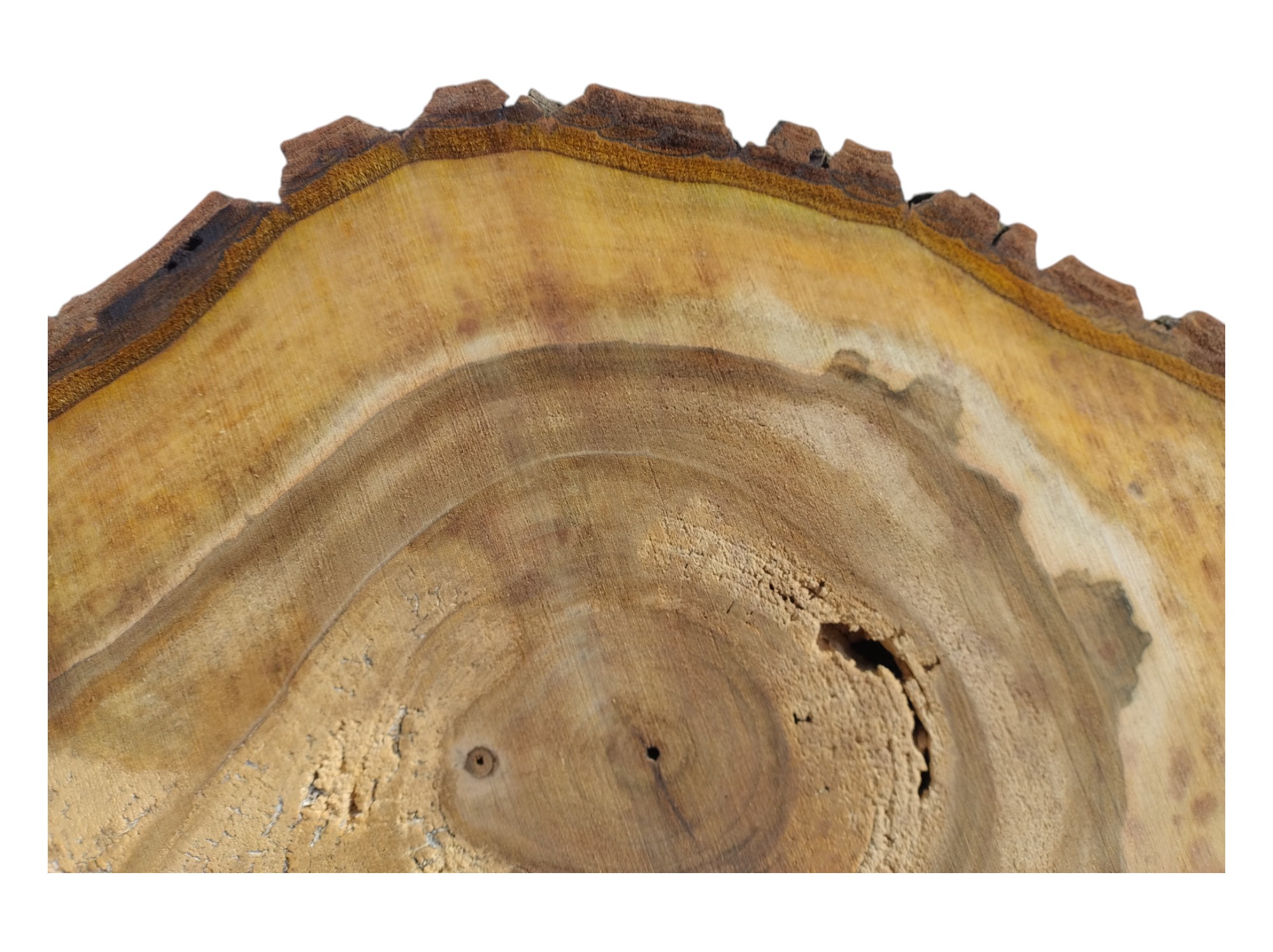 Zdjęcia robimy od razu po przecięciu, żeby jak najlepiej pokazać w jaki sposób można wyprowadzić plaster i podkreślić jego strukturę. W procesie suszenia naturalną rzeczą są pęknięcia materiału powstałe w skutek oddawania wilgoci oraz powierzchowna zmiana barwy. Zdjęcie nr 2 w galerii przedstawia stan plastra z lutego 2025 – wtedy została zmierzona podana wilgotność.