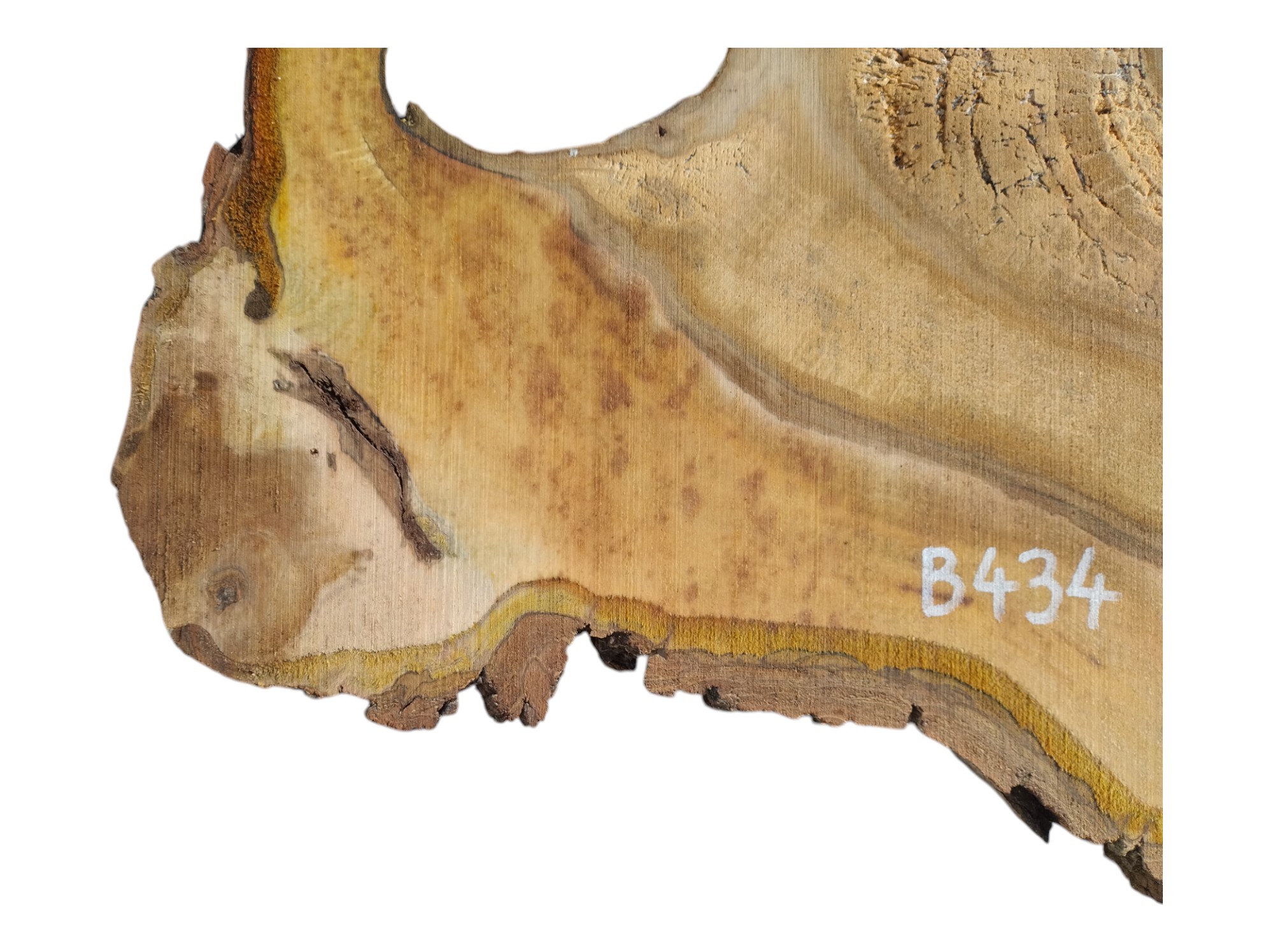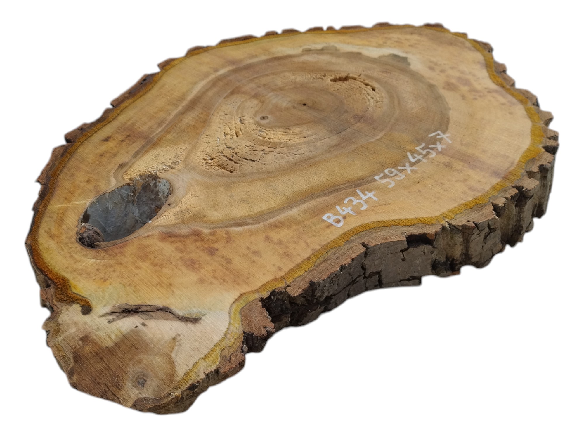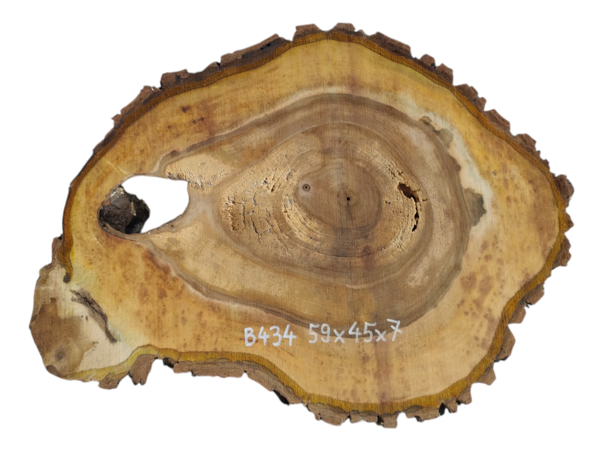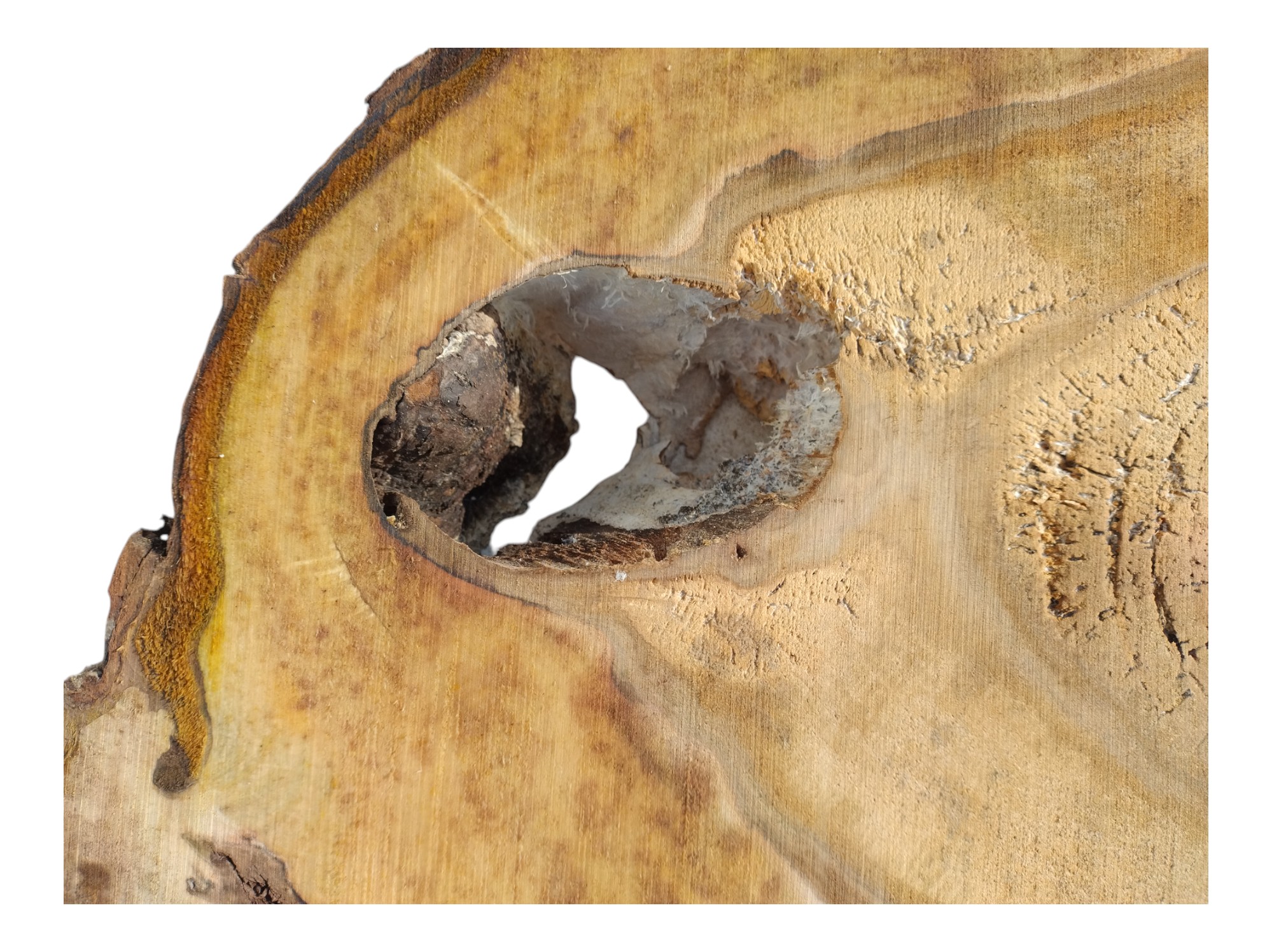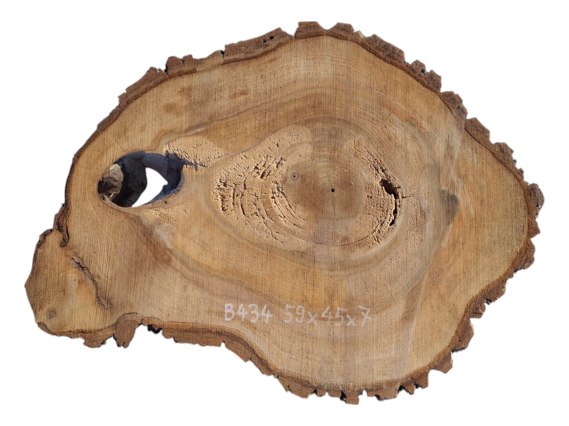 Zdjęcia robimy od razu po przecięciu, żeby jak najlepiej pokazać w jaki sposób można wyprowadzić plaster i podkreślić jego strukturę. W procesie suszenia naturalną rzeczą są pęknięcia materiału powstałe w skutek oddawania wilgoci oraz powierzchowna zmiana barwy. Zdjęcie nr 2 w galerii przedstawia stan plastra z lutego 2025 – wtedy została zmierzona podana wilgotność.