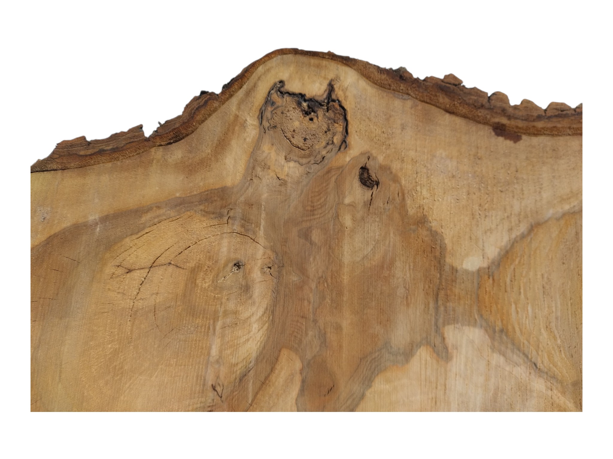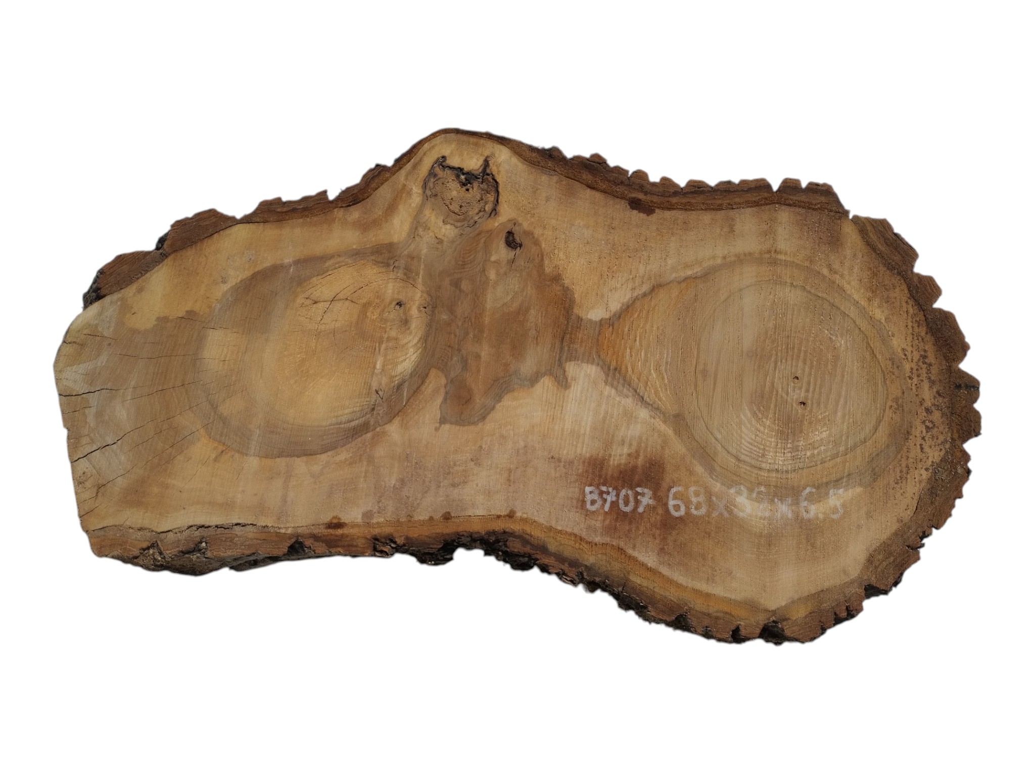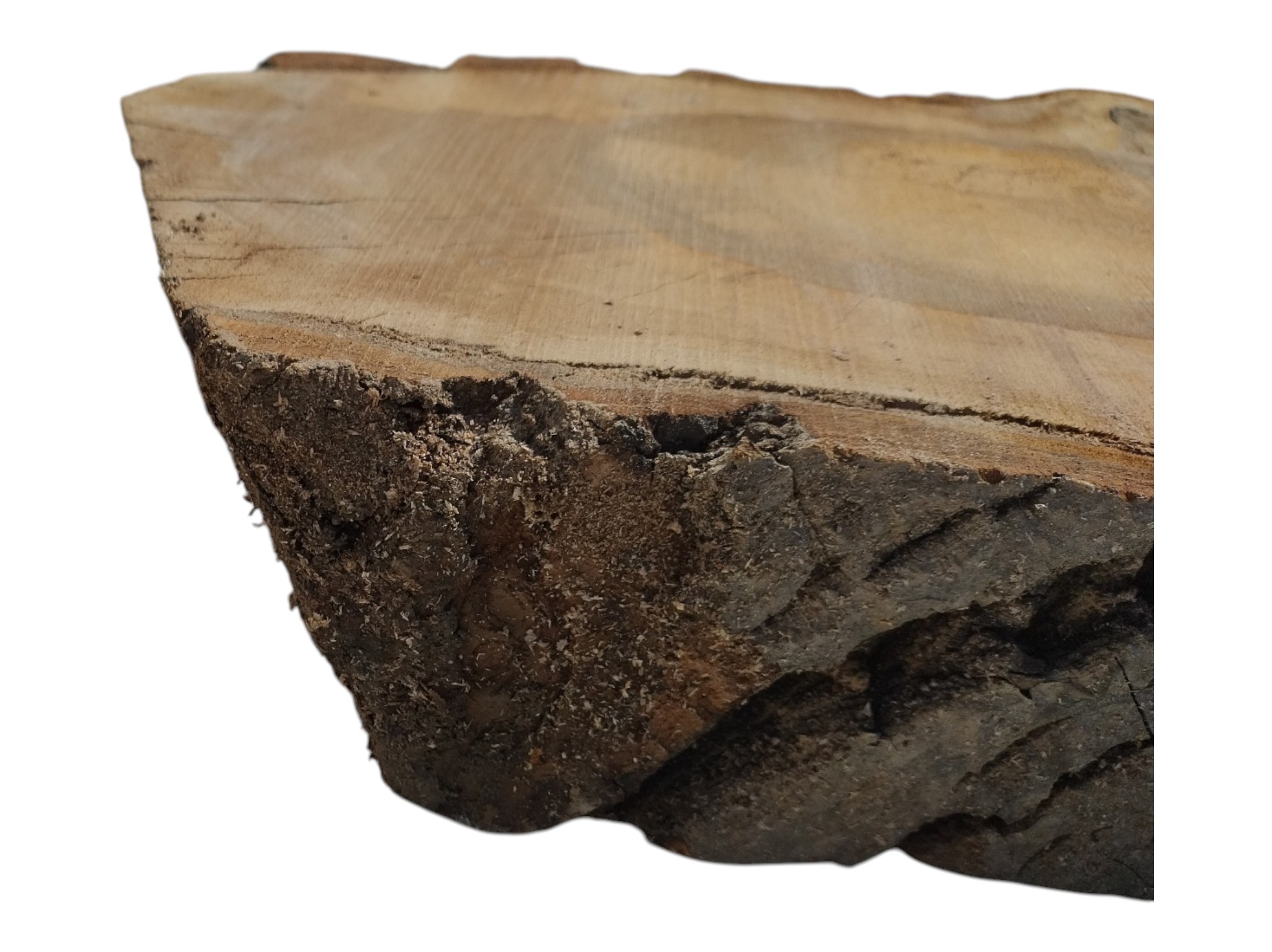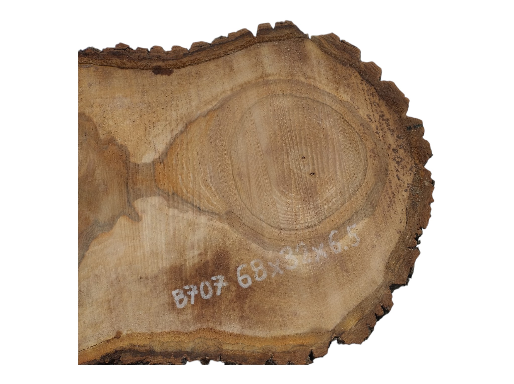 Zdjęcia robimy od razu po przecięciu, żeby jak najlepiej pokazać w jaki sposób można wyprowadzić plaster i podkreślić jego strukturę. W procesie suszenia naturalną rzeczą są pęknięcia materiału powstałe w skutek oddawania wilgoci oraz powierzchowna zmiana barwy. Zdjęcie nr 2 w galerii przedstawia stan plastra z kwietnia 2026 – wtedy została zmierzona podana wilgotność.