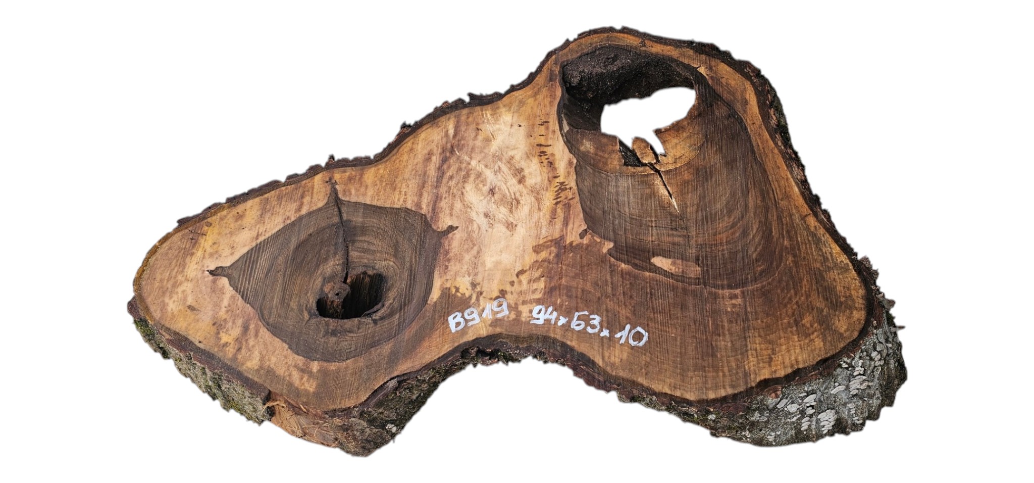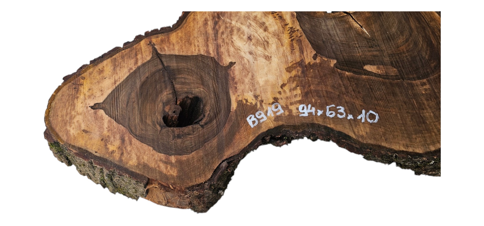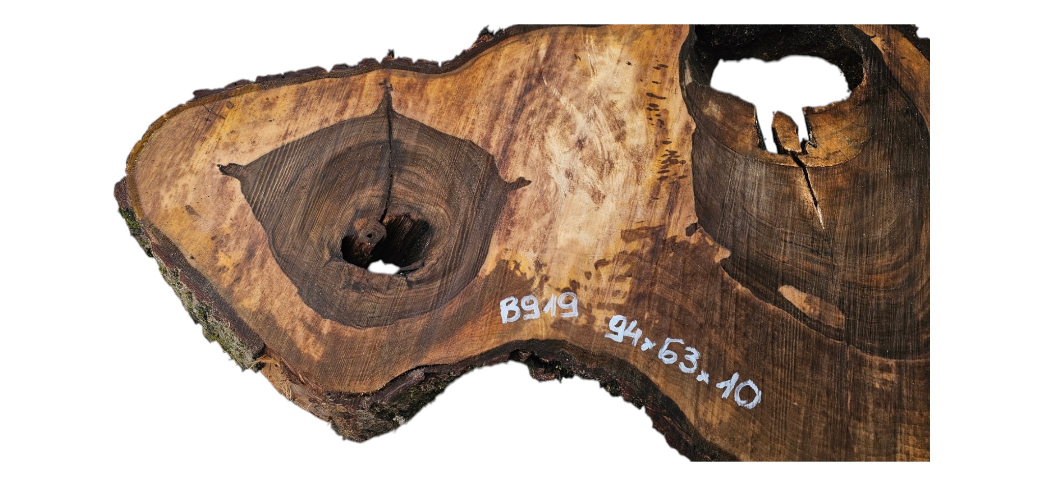 Zdjęcia robimy od razu po przecięciu, żeby jak najlepiej pokazać w jaki sposób można wyprowadzić plaster i podkreślić jego strukturę. W procesie suszenia naturalną rzeczą są pęknięcia materiału powstałe w skutek oddawania wilgoci oraz powierzchowna zmiana barwy. Zdjęcie nr 2 w galerii przedstawia stan plastra po wyciągnięciu z suszarni.