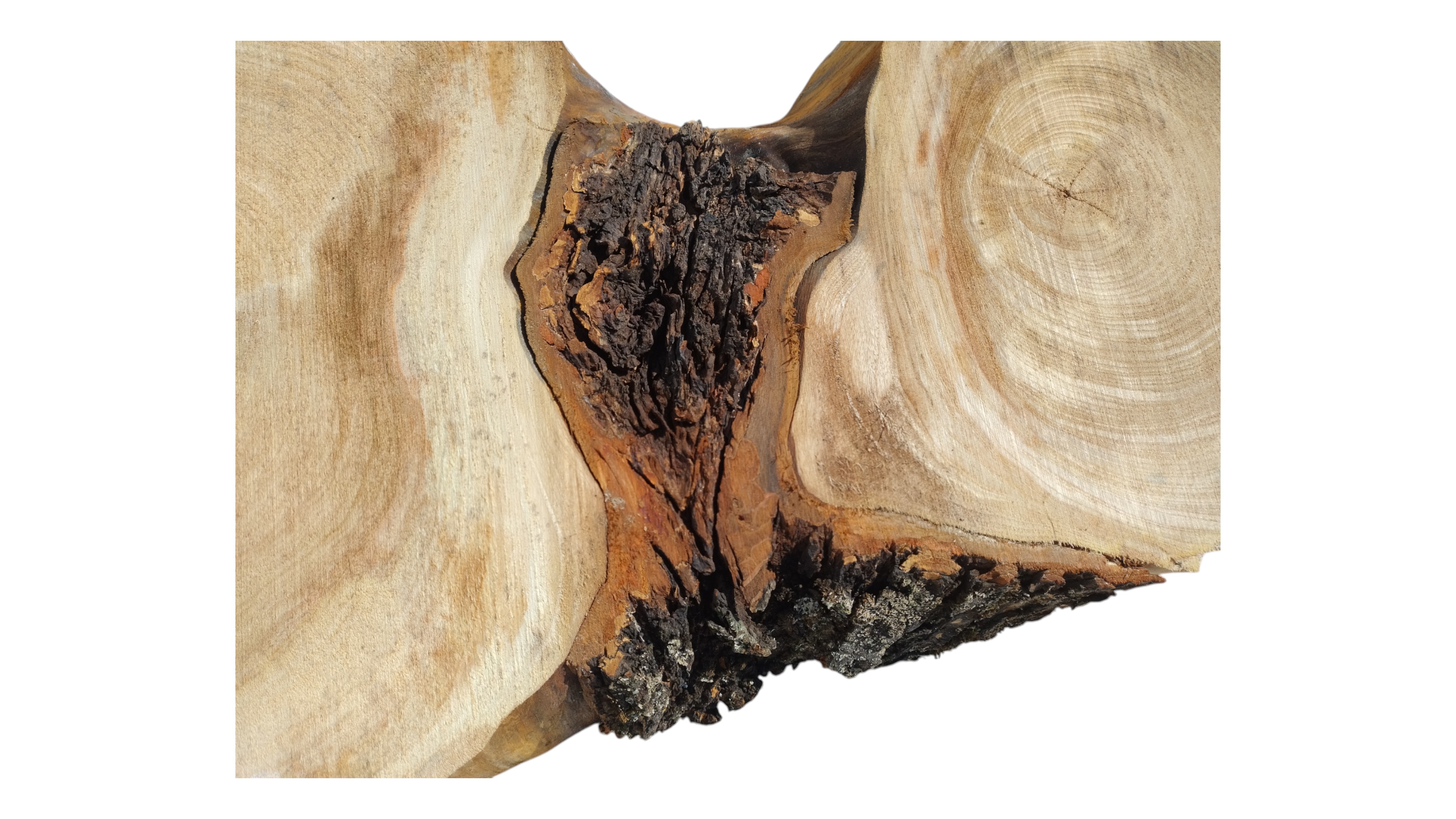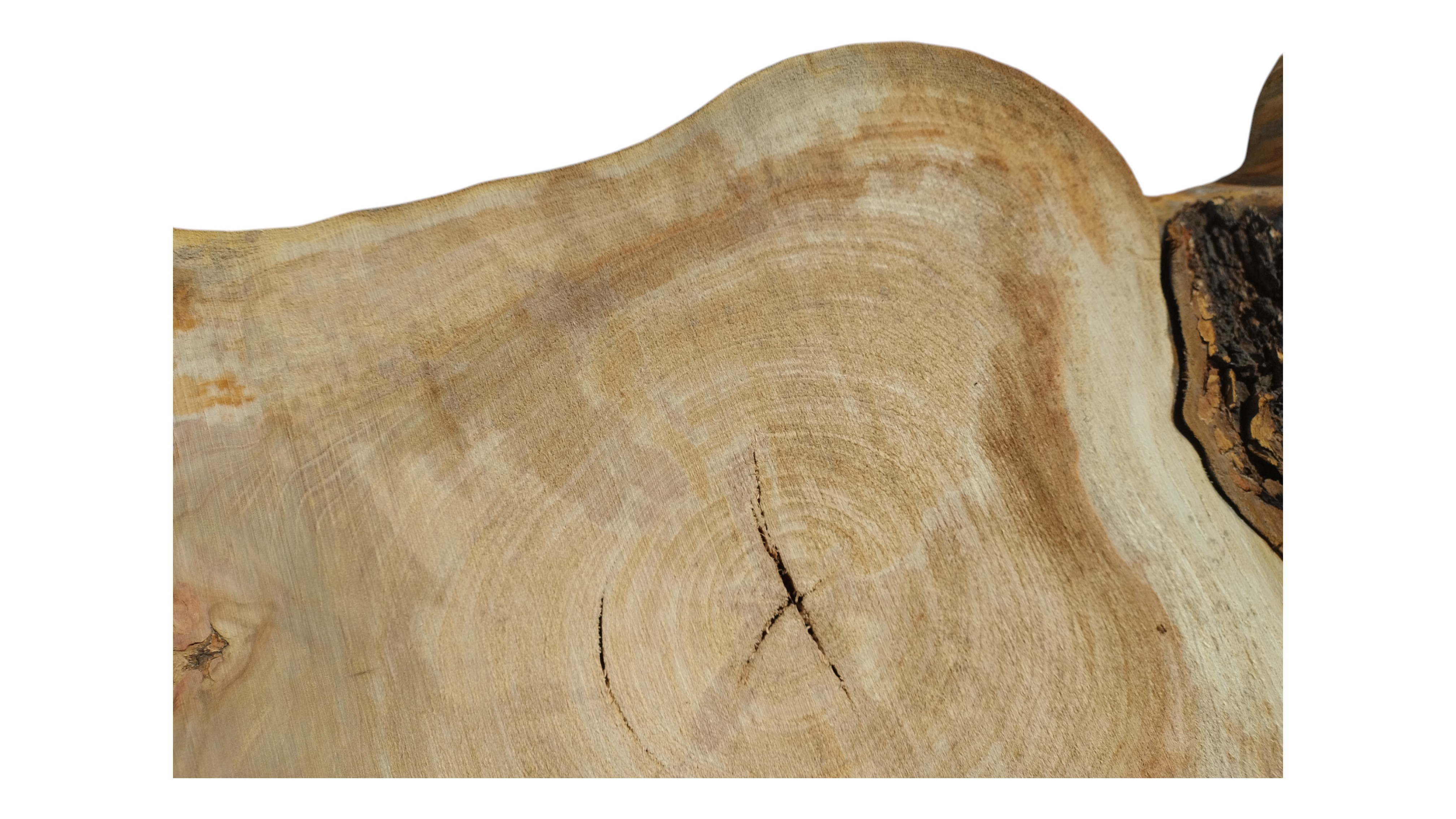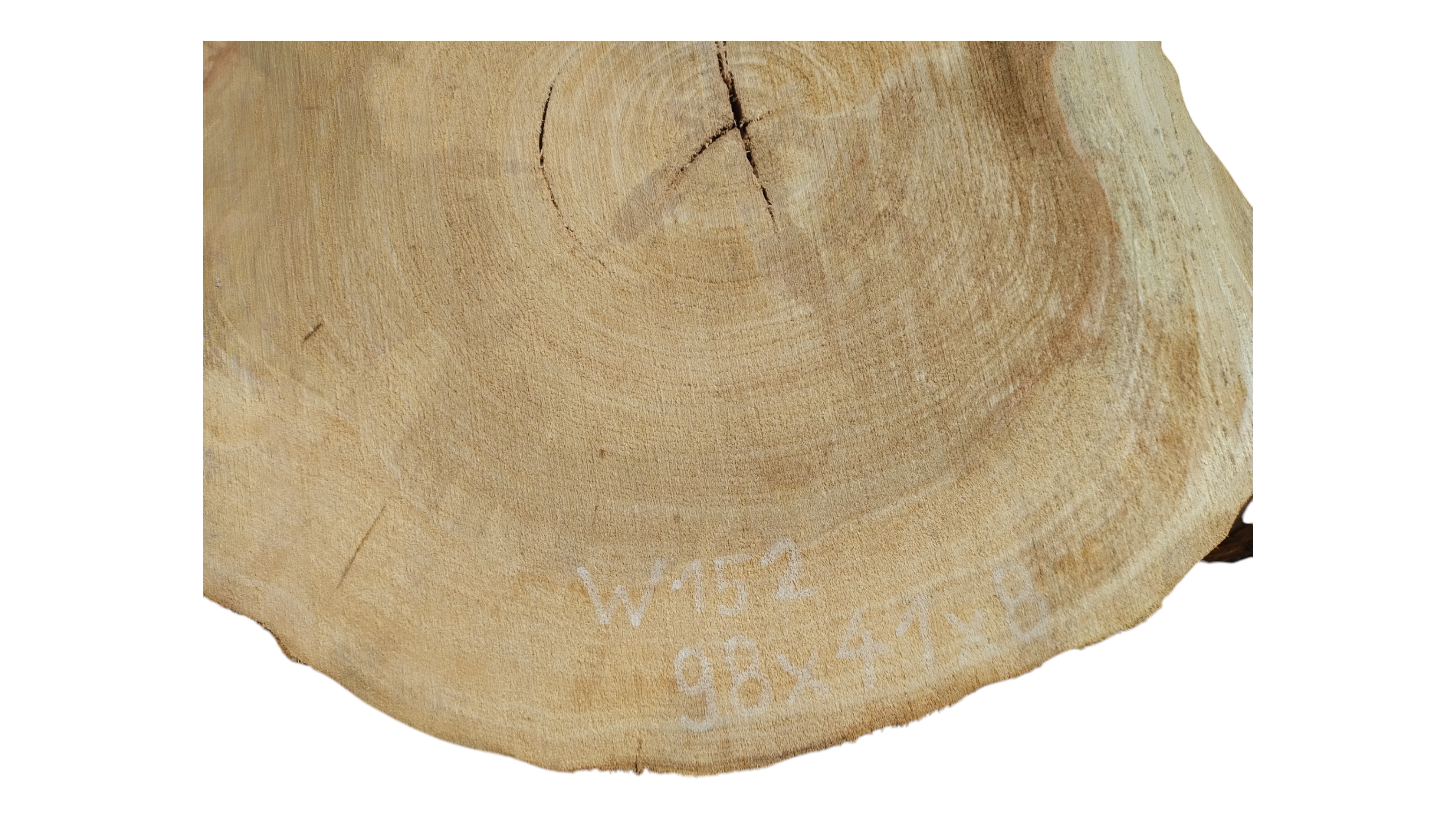 Zdjęcia robimy od razu po przecięciu, żeby jak najlepiej pokazać w jaki sposób można wyprowadzić plaster i podkreślić jego strukturę. W procesie suszenia naturalną rzeczą są pęknięcia materiału powstałe w skutek oddawania wilgoci oraz powierzchowna zmiana barwy. Zdjęcie nr 2 w galerii przedstawia stan plastra z lutego 2025 – wtedy została zmierzona podana wilgotność.